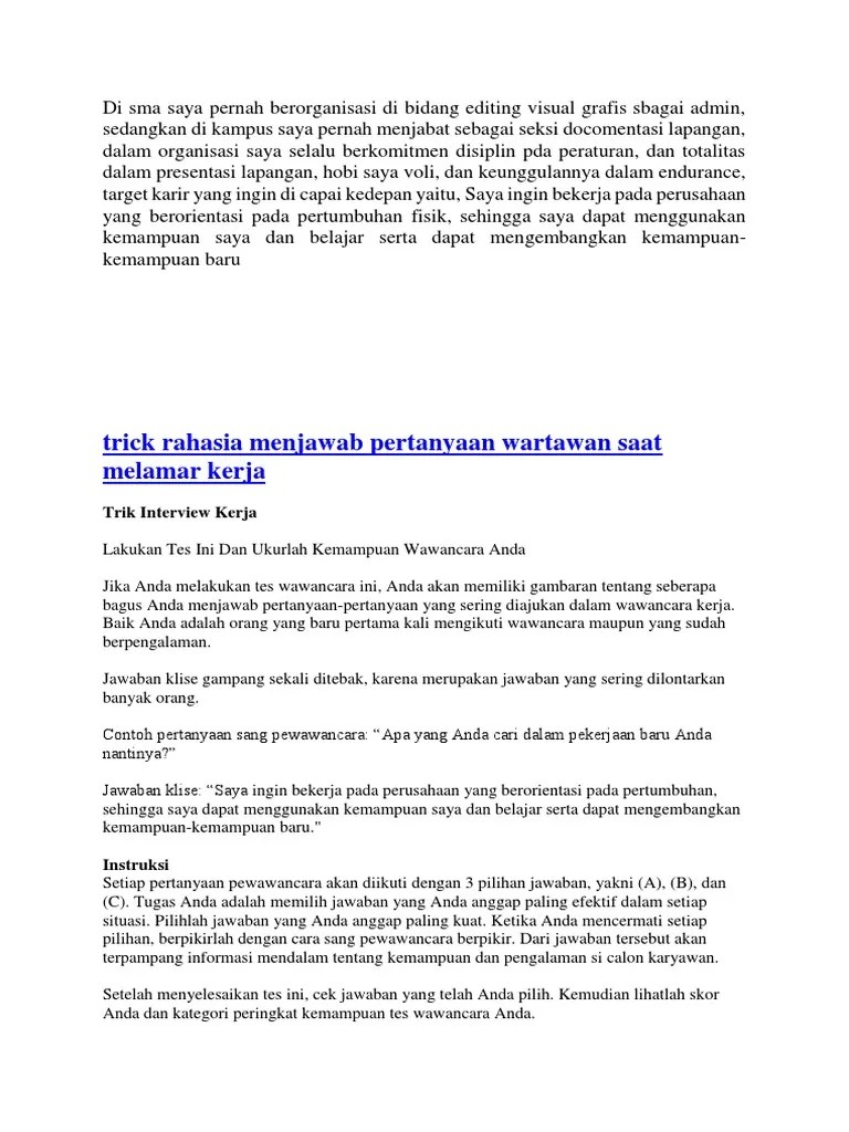 12 calon perangkat desa ini merupakan calon yang telah dinyatakan lolos tes kesehatan yang dilaksanakan kemarin 711 di. Pengalaman tes wawancara psikologi ( pertanyaan dan jawabanya ) kali ini saya akan menceritakan pengalaman pribadi tentang pertanyaan dan jawaban wawancara psikologi ketika saya melakukan sesi interview kerja dengan sikolog.proses interviw dengan psikiater ini saya lakukan ketika melamar pekerjaan di perusahaan atau pt di daerah cikarang. Contoh soal tes cpns 2018 untuk lulusan sma smk info cpns 2019 contoh soal cpns seleksi kompetisi dasar skd jawaban 2018 contoh soal tes cpns cara cepat jawab twk tiu tkp usai syarat pendaftaran cpns untuk lulusan sma smk slta tahun 2019 panduan tes wawancara seleksi kompentensi bidang skb cpns contoh soal cpns 2018 daftar cpns 2018 untuk. Bagaimana menjawab pertanyaan "ceritakan tentang diri kamu" Seleksi osis yang paling umum ialah wawancara atau yang biasa dikenal dengan tes interview.